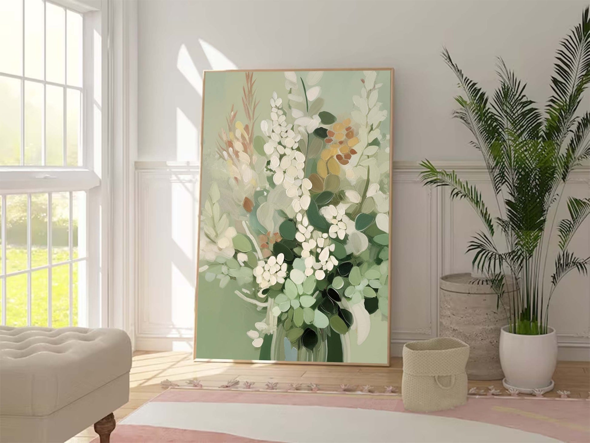 Enhance your home décor with our Elegant Floral Oil Painting featuring a stunning green and white bouquet. This exquisite artwork brings tranquility and sophistication to any space, making it the perfect statement piece for living rooms, bedrooms, or offices. Discover the beauty of nature through our meticulously crafted oil painting and elevate your interior design today!
