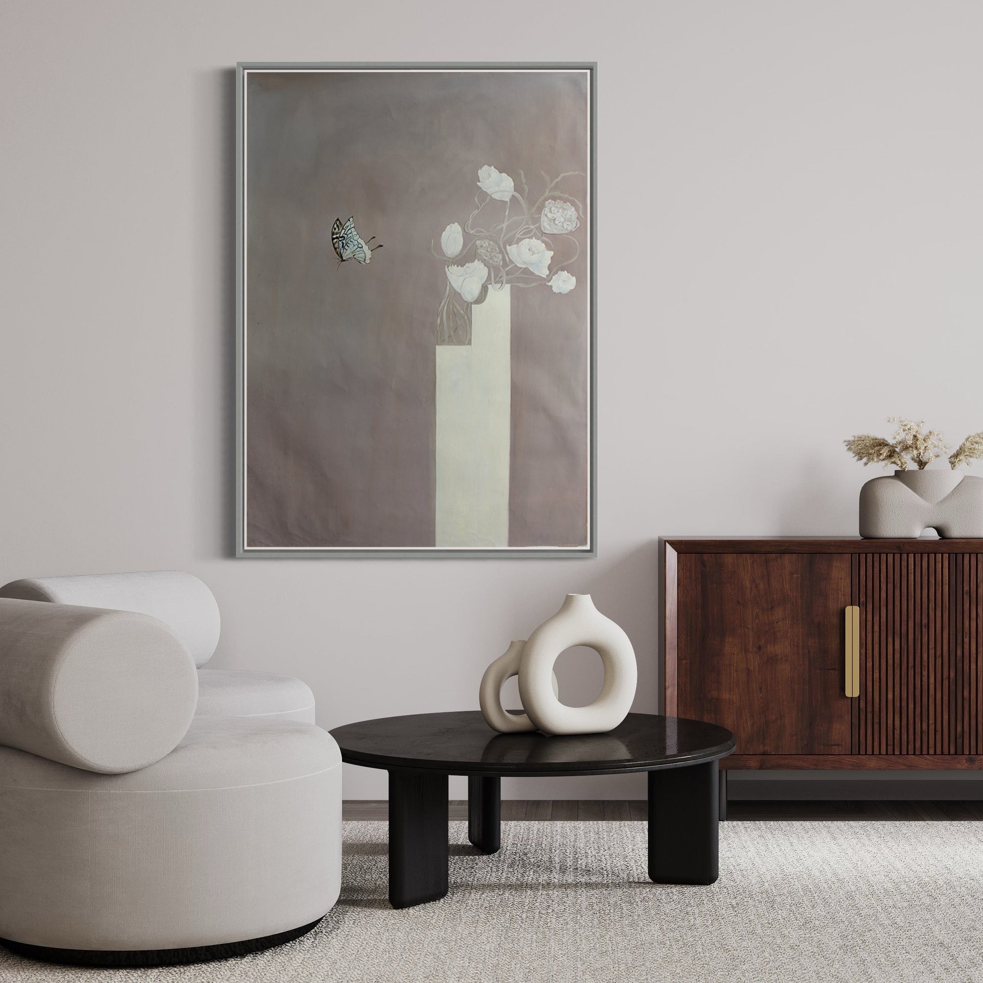 Elegant Floral Still Life with Butterfly in Soft Earth Tones Oil Painting