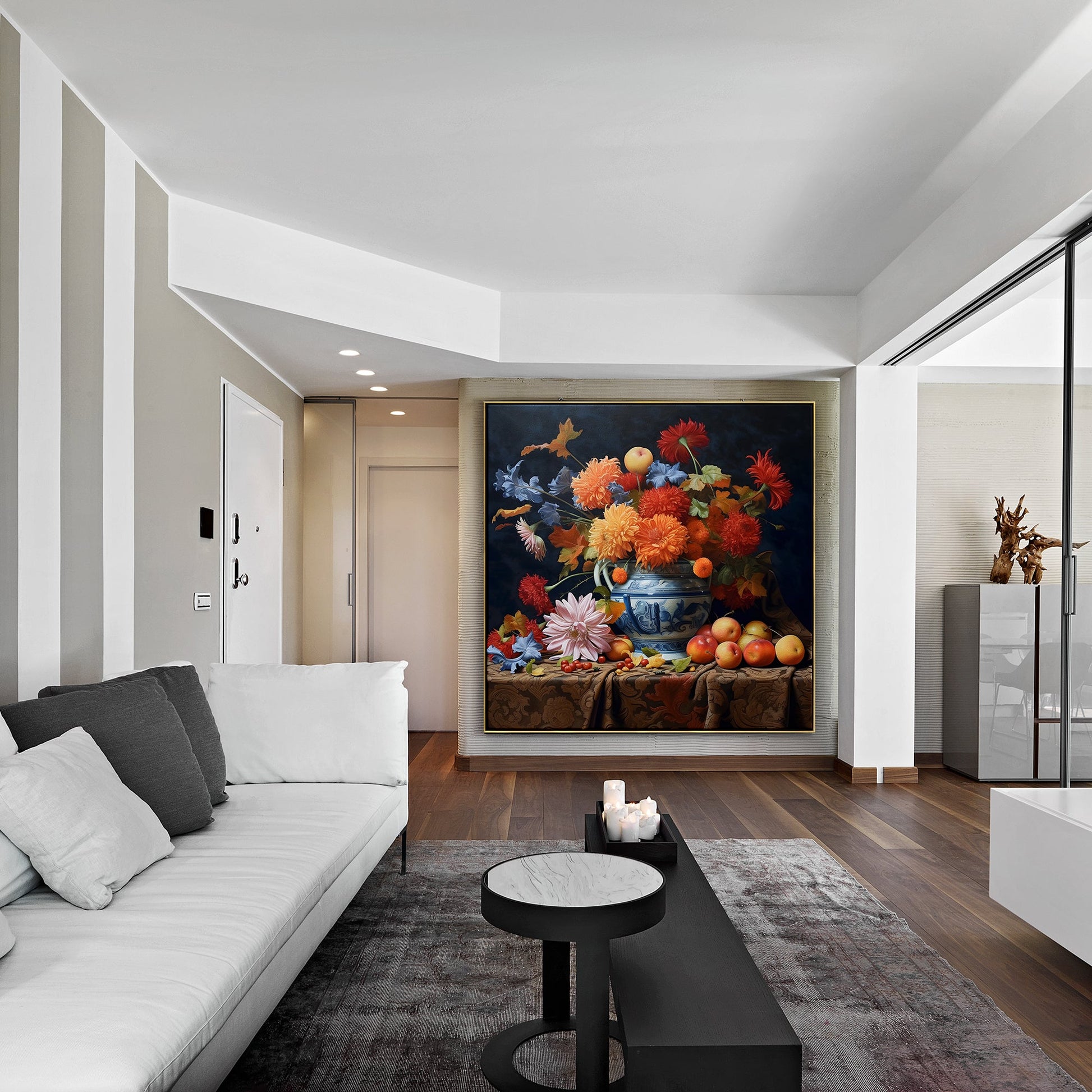 Vibrant Floral Still Life Oil Painting with Fruits and Blue Pot