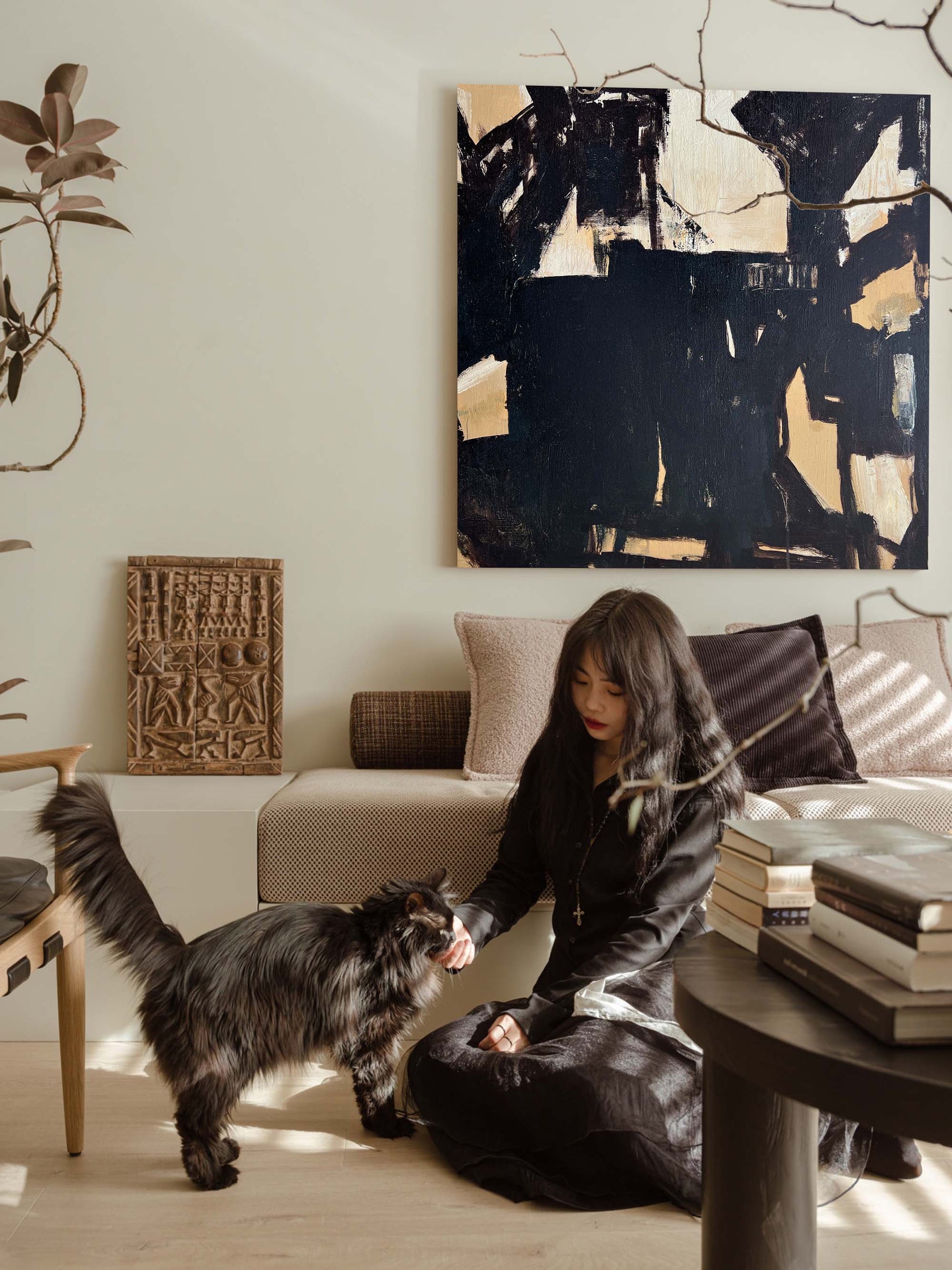 Contemporary Minimalist Abstract Oil Painting with Bold Black and Beige Design