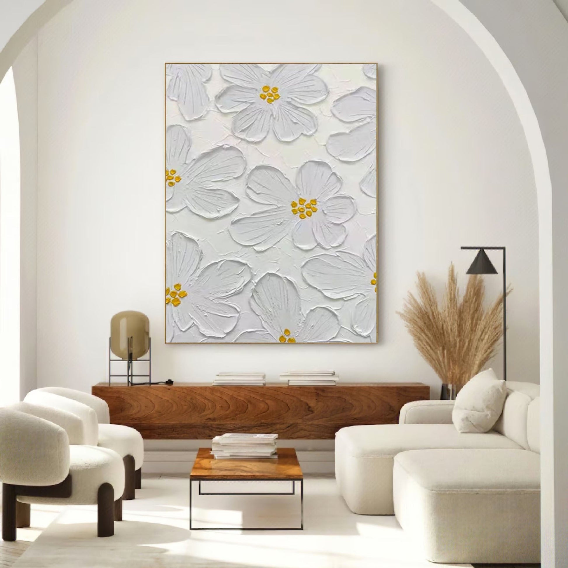 Elegant White Floral Oil Painting for Minimalist Home Decor