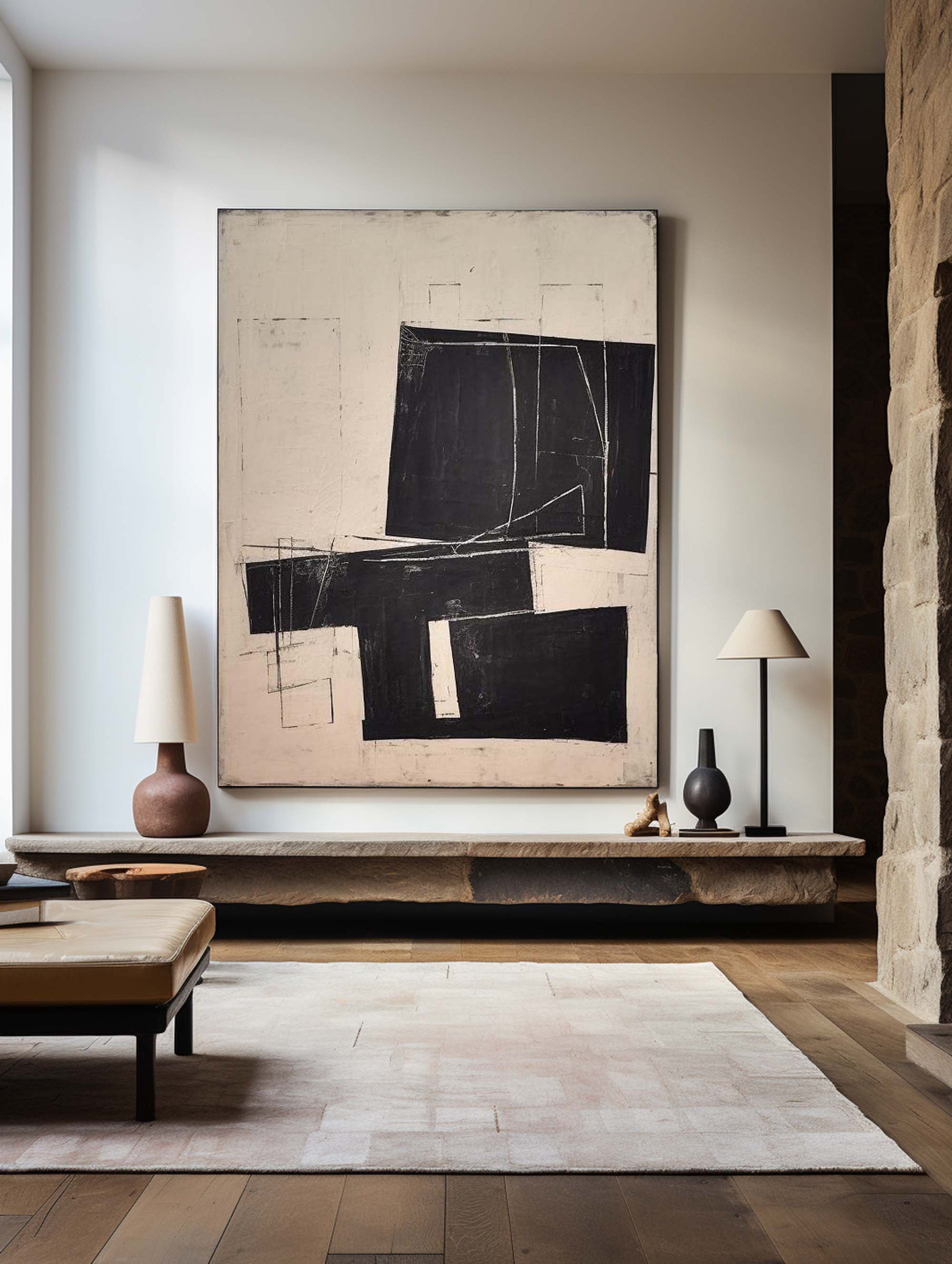 Contemporary Minimalist Black and White Abstract Oil Painting for Modern Homes
