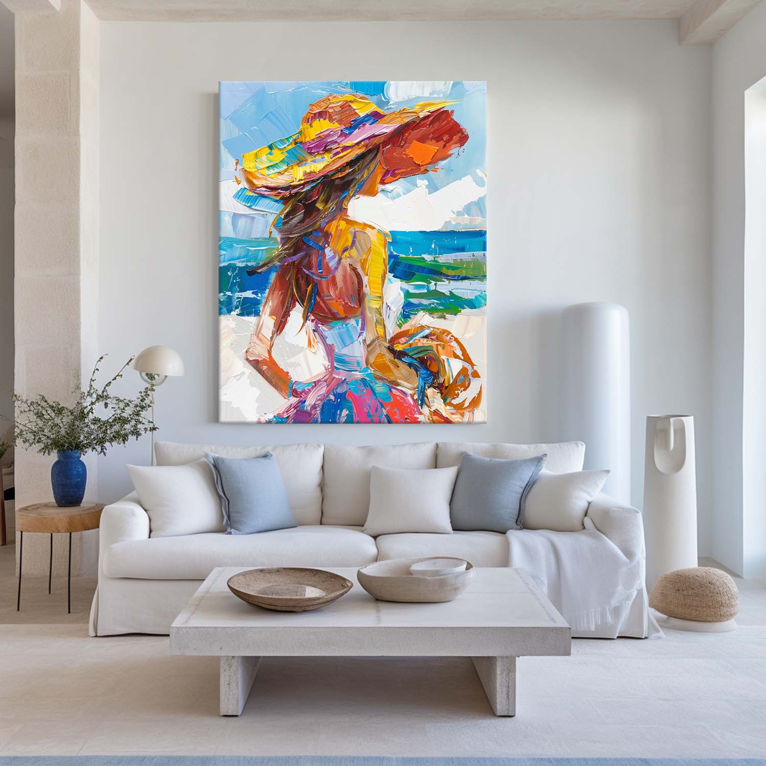 Vibrant Coastal Woman in Hat | Colorful Abstract Oil Painting for Modern Decor
