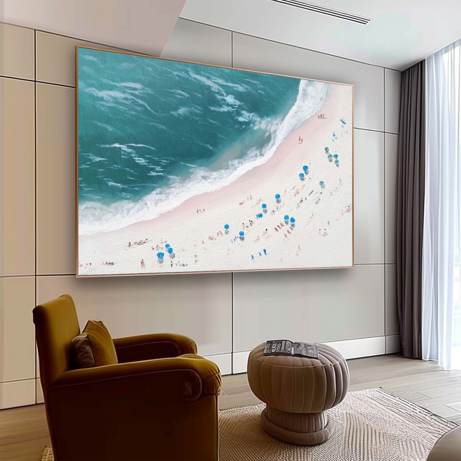 Experience the blissful tranquility of our 'Serene Beachscape Oil Painting,' featuring vibrant ocean hues and idyllic sunbathers. This stunning artwork captures the essence of summer relaxation, inviting a sense of calm and joy into your space. Perfect for beach lovers and art enthusiasts alike, this painting is a beautiful addition to any home decor. Explore the vibrant colors and serene atmosphere of coastal life today!
