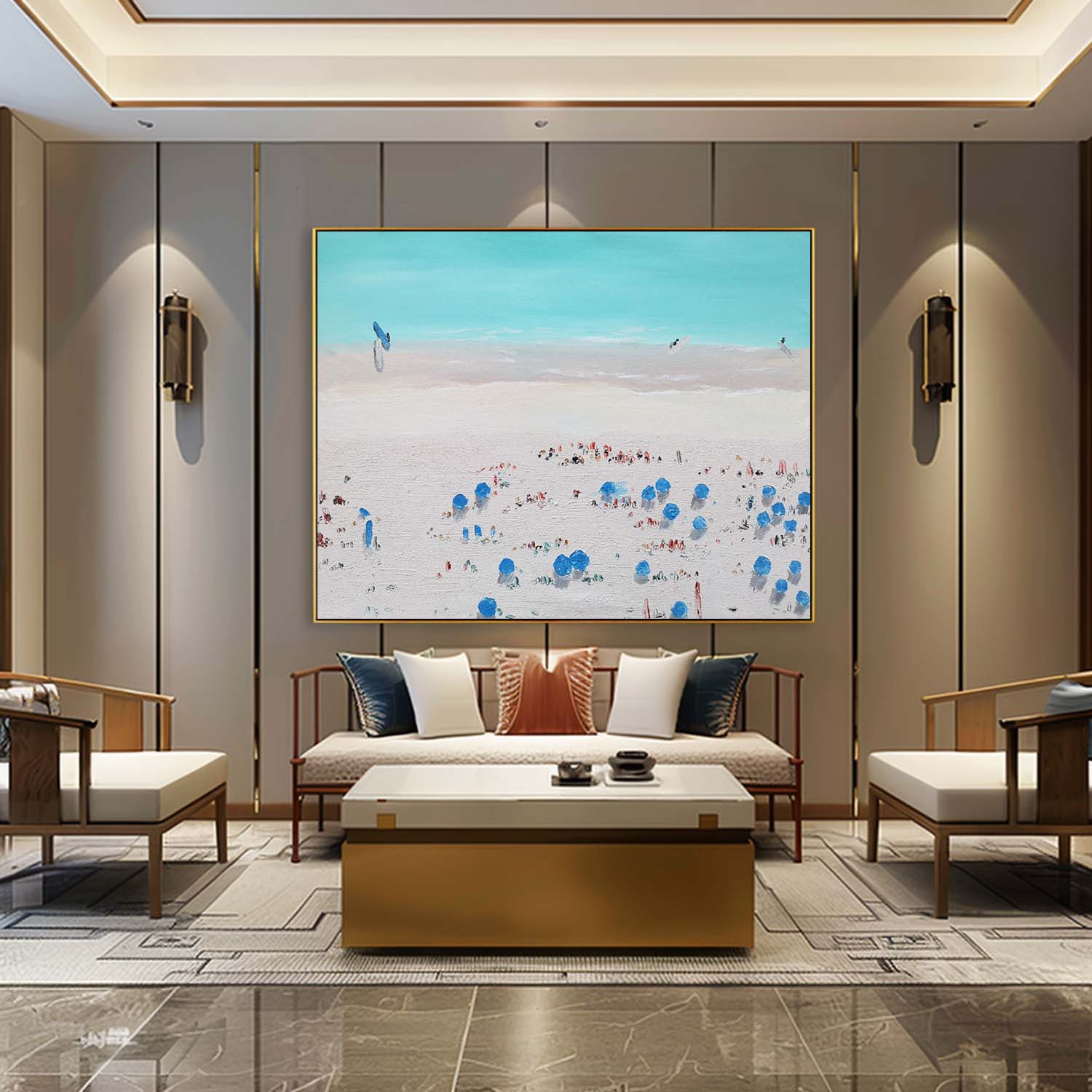 Discover a stunning oil painting that captures a vibrant beach scene, featuring colorful umbrellas dotting the sunlit shore under a soft, serene sky. This exquisite artwork brings the essence of summer to life, perfect for adding a splash of color and warmth to any space. Experience the beauty and tranquility of coastal living through this breathtaking piece that evokes relaxation and joy. Transform your home or office with this captivating beach-themed art today!