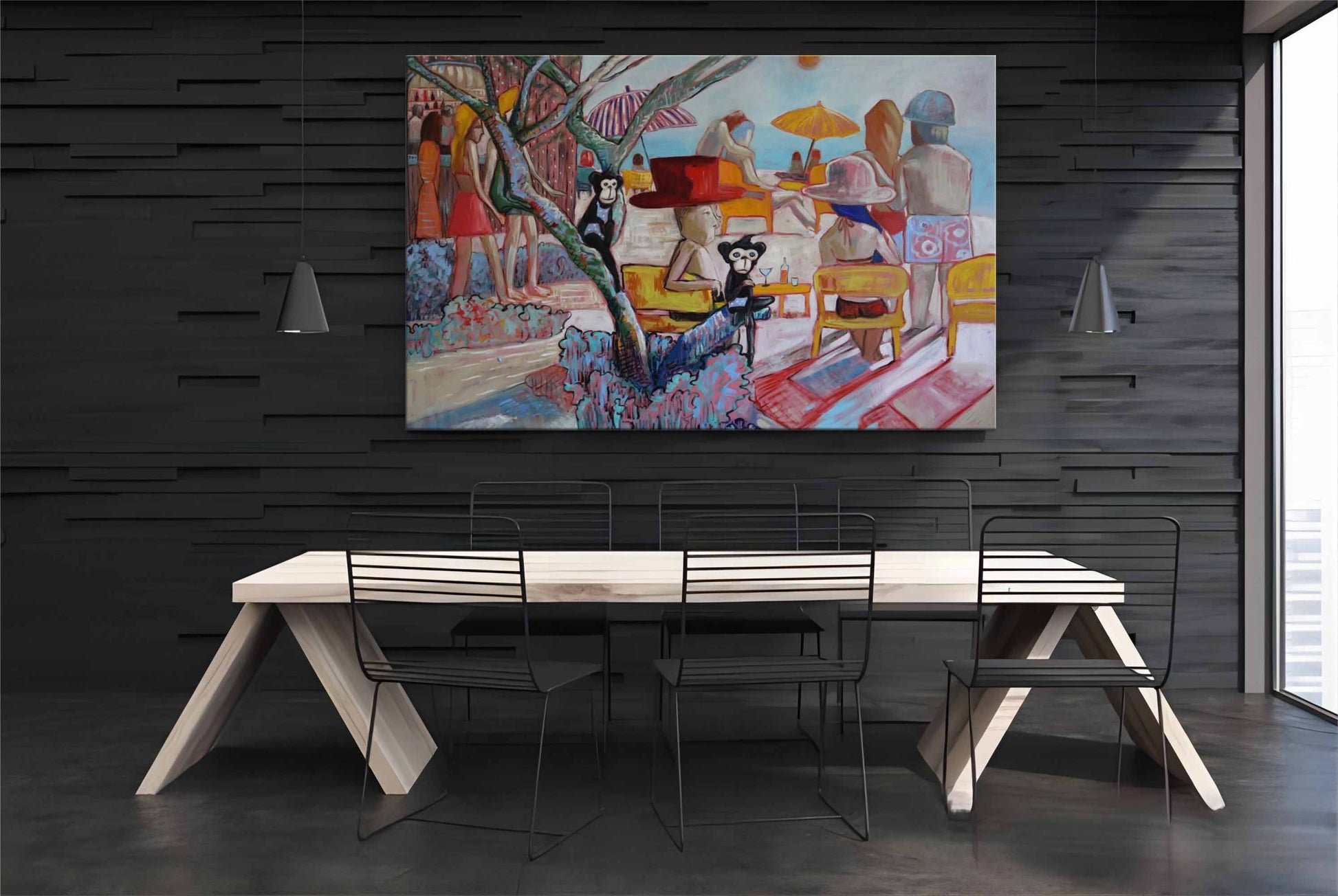 Whimsical Beach Scene with Monkeys and Colorful Umbrellas - Unique Pop Art Oil Painting