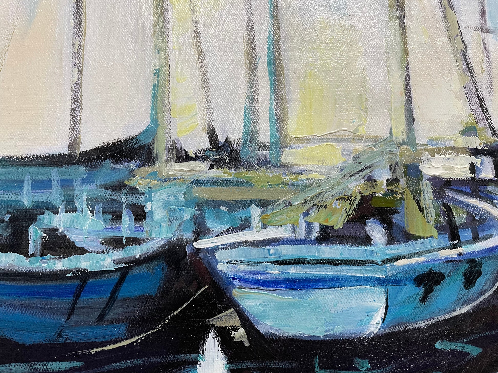 Serene Harbor Scene: Resting Sailboats In Tranquil Waters - Stunning Oil Painting