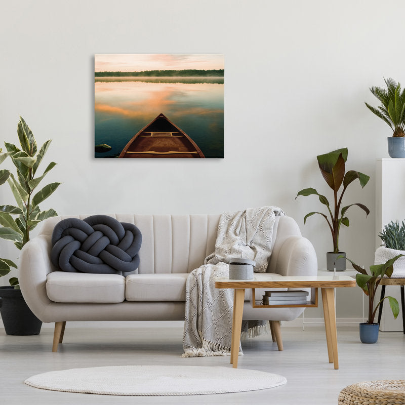 Tranquil Canoe at Sunrise on Serene Lake with Stunning Water Reflection