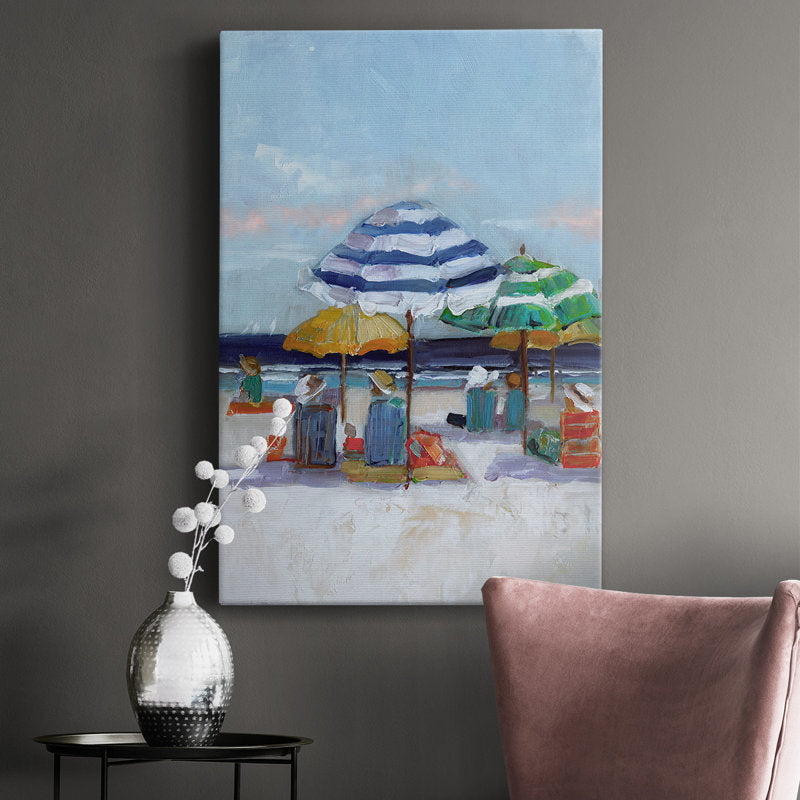 Vibrant Beach Day with Colorful Umbrellas and Relaxing Figures