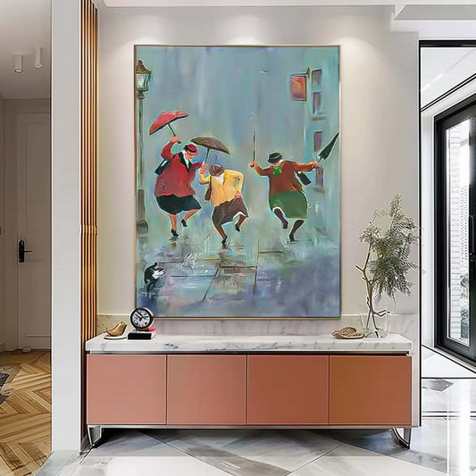 Joyful Rain Dance - Vibrant Oil Painting of People with Umbrellas